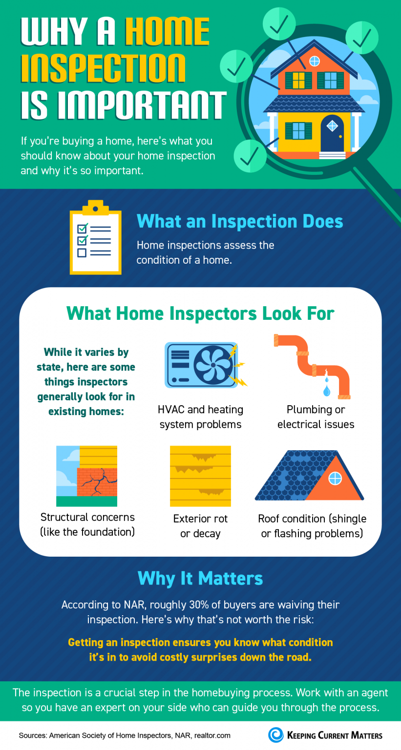 - A home inspection is a crucial step in the homebuying process. It assesses the condition of the home you plan to purchase so you can avoid costly surprises down the road.